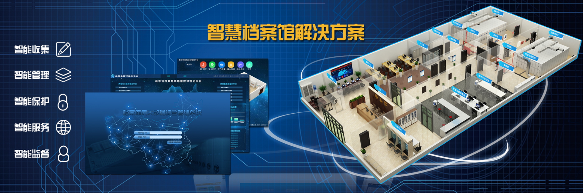 國韻根據山東省委宣傳部檔案管理的實際需求,為其設計建設了檔案庫房智能化綜合管理系統,該系統將溫濕度自動測控、智能防火、智能防盜、消毒滅菌等檔案保護功能集成于綜合管理平臺,實現了檔案保護管理的智能化。該項目改善了山東省委宣傳部檔案庫房的環(huán)境,強化了對檔案的管理和保護。